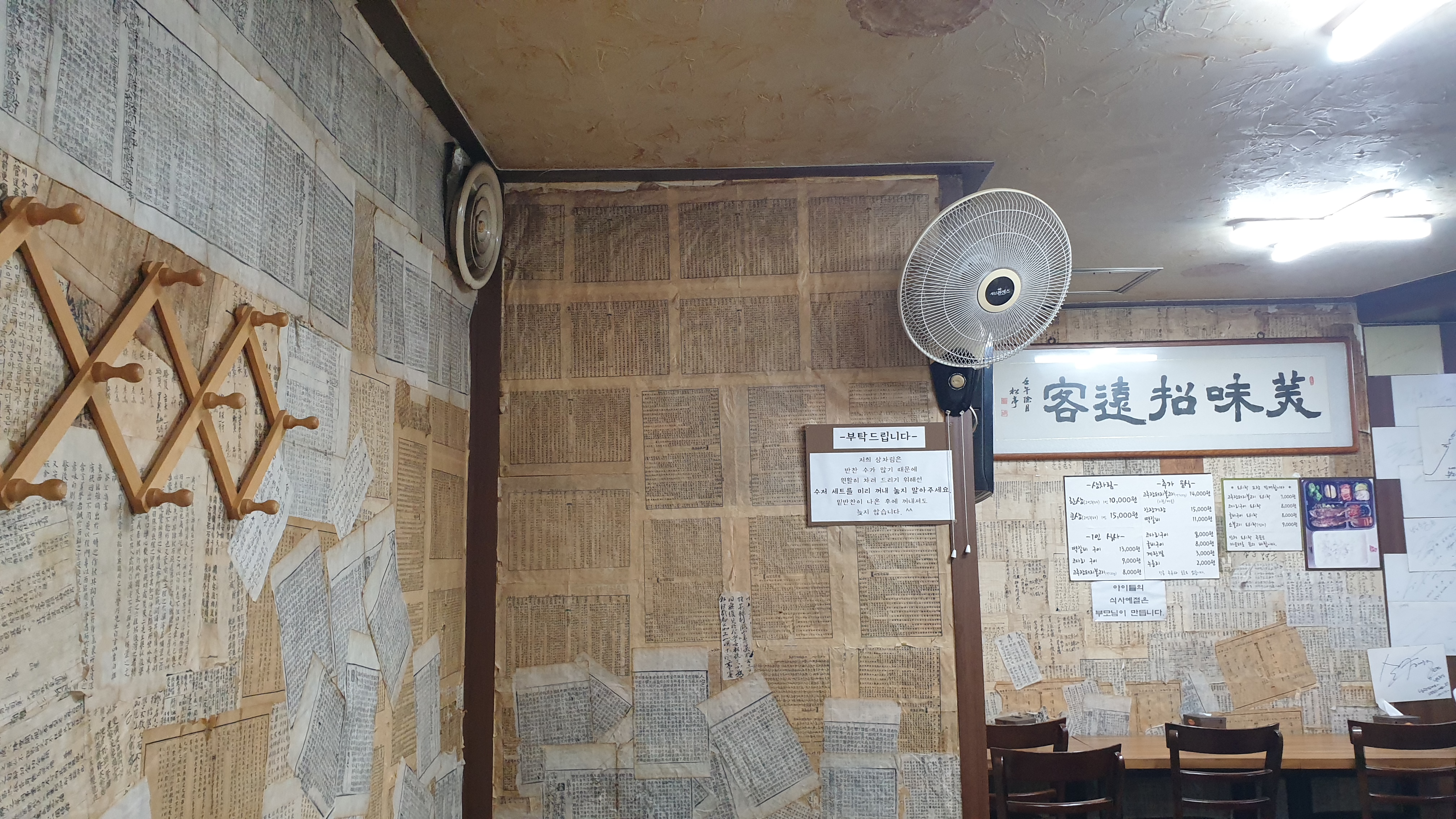 실내는 오래된 서적을 찢어서 붙여놓은 듯한