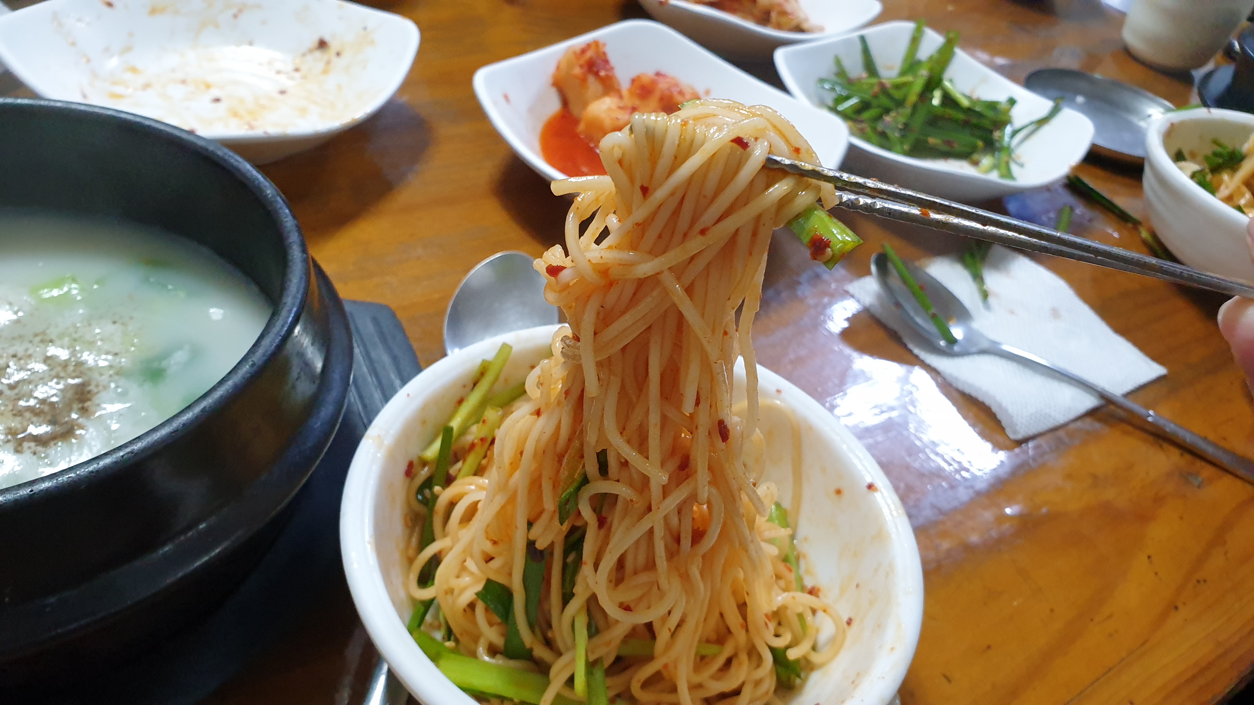 살짝 통통한 중면에 양념장 한 숟가락 얹어 있는 모습이잖아요.