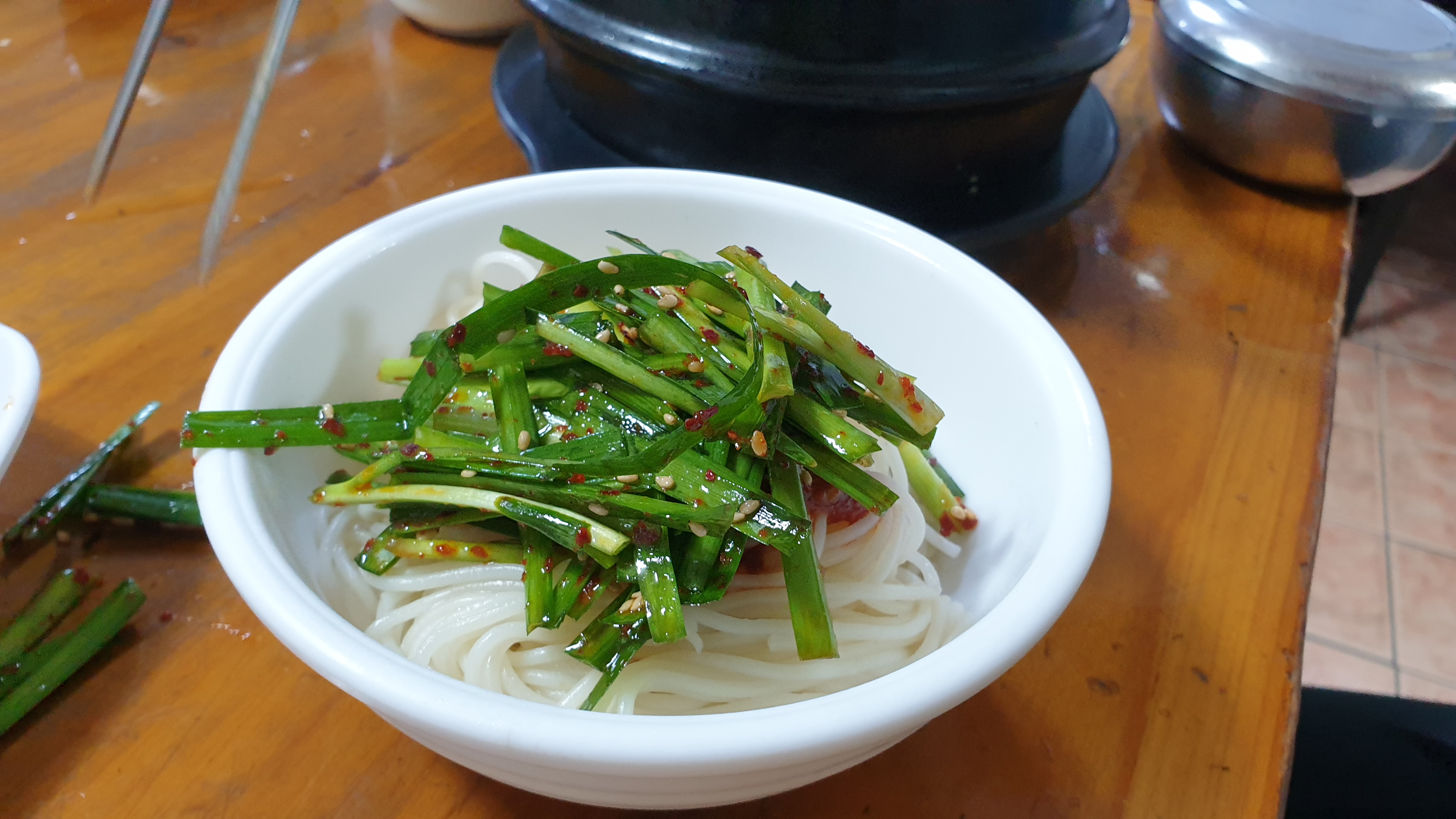 바로 이 국수를 비빌때 부추를 넣고 비벼야 한답니다.