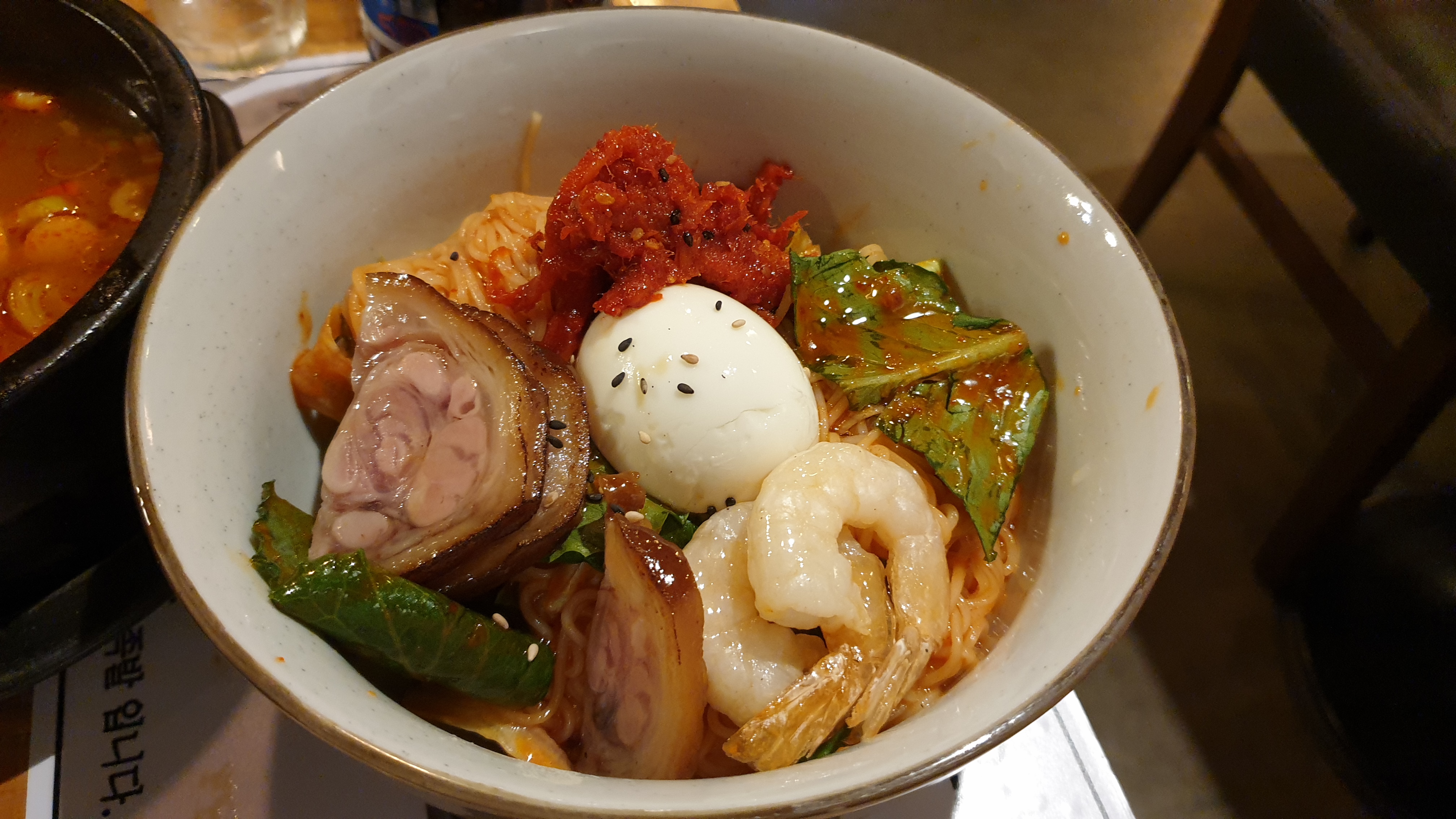 매콤새콤한 비빔면에 족발, 새우, 계란 등이